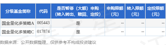 注:1、自2025年10月22日起,国金基金管理有限公司(以下简称“本公司”)对国金量化多策略灵活配置混合型证券投资基金(以下简称“本基金”或“国金量化多策略”)的所有渠道所有投资者单个基金账户的申购投资限额设置为:国金量化多策略A及国金量化多策略C的投资者单个开放日单笔申购及单个开放日累计申购金额不得超过1000万元,如超过1000万元,本基金管理人将有权拒绝。2、投资者在本基金基金合同约定之外的日期和时间提出申购申请的,视为下一个开放日的申请。3、在设置本基金申购金额限制业务实施期间,本基金的开户、申购、赎回等其它业务仍照常办理。如本基金新增代销机构,同样适用以上投资限额。4、本基金管理人可以根据市场情况调整上述标准,届时详见相关公告。