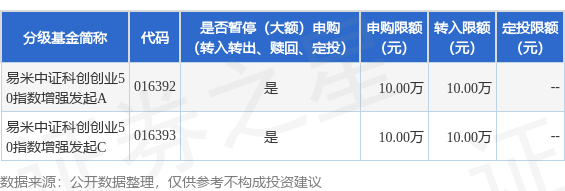 本站消息,10月22日易米基金管理有限公司发布《易米中证科创创业50指数增强型发起式证券投资基金暂停大额申购(含转换转入、定期定额投资)业务的公告》。公告中提示,为保障基金的平稳运作,维护基金份额持有人利益,自2025年10月22日起易米中证科创创业50指数增强型发起式证券投资基金暂停大额申购(含转换转入、定期定额投资)业务,申购、转换转入上限金额为10.0万元真牛所,下属分级基金调整明细如下: