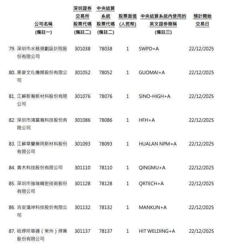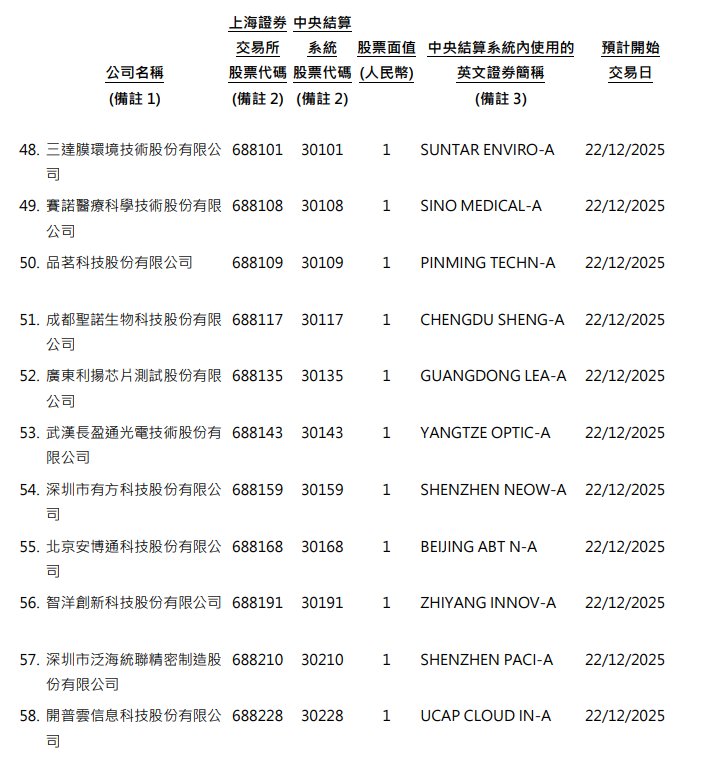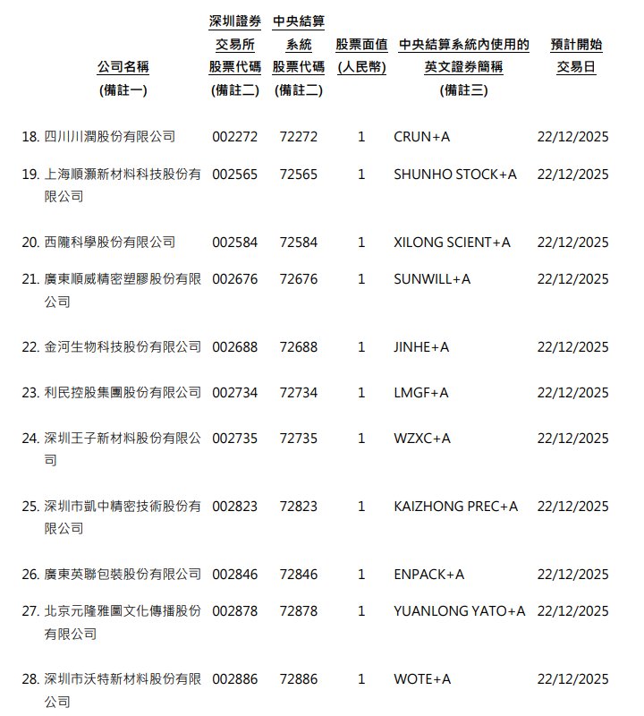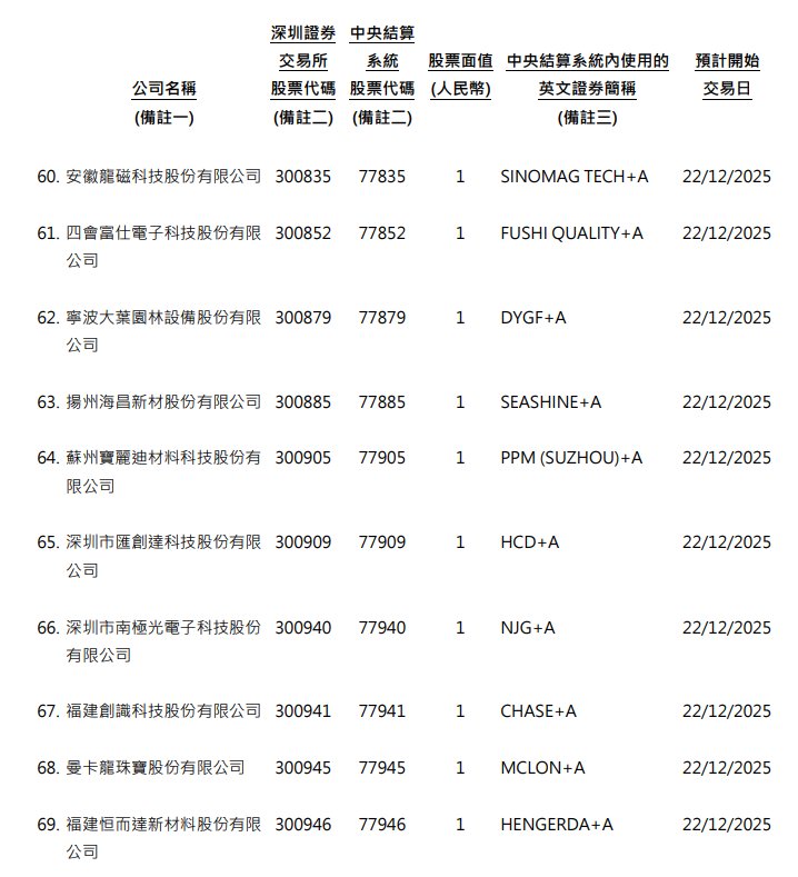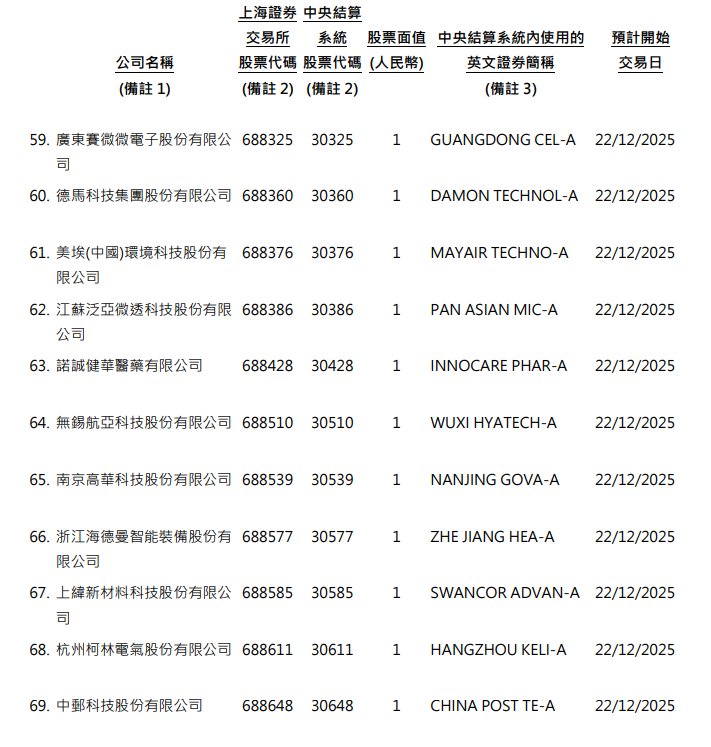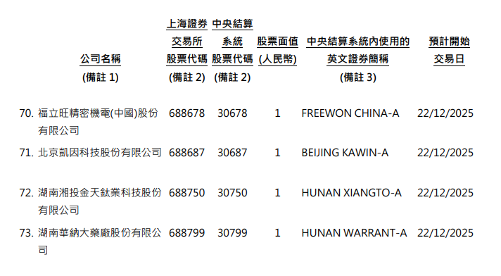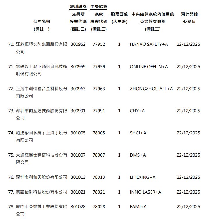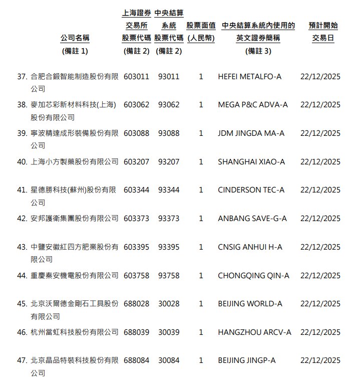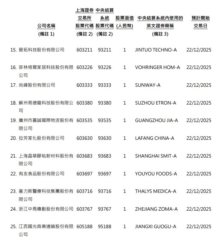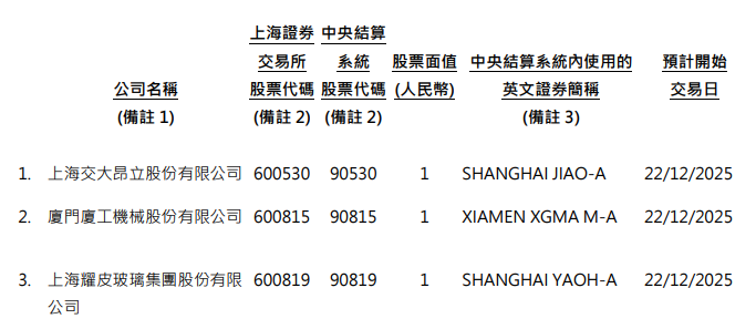 12月17日,港交所发布公告称,交大昂立(600530)(600530.SH)、厦工股份(600815)(600815.SH)、耀皮玻璃(600819)(600819.SH)等共73只股票获纳入沪股通;飞亚达(000026)(000026.SZ)、创元科技(000551)(000551.SZ)等共108只股票获纳入深股通,2025年12月22日生效。