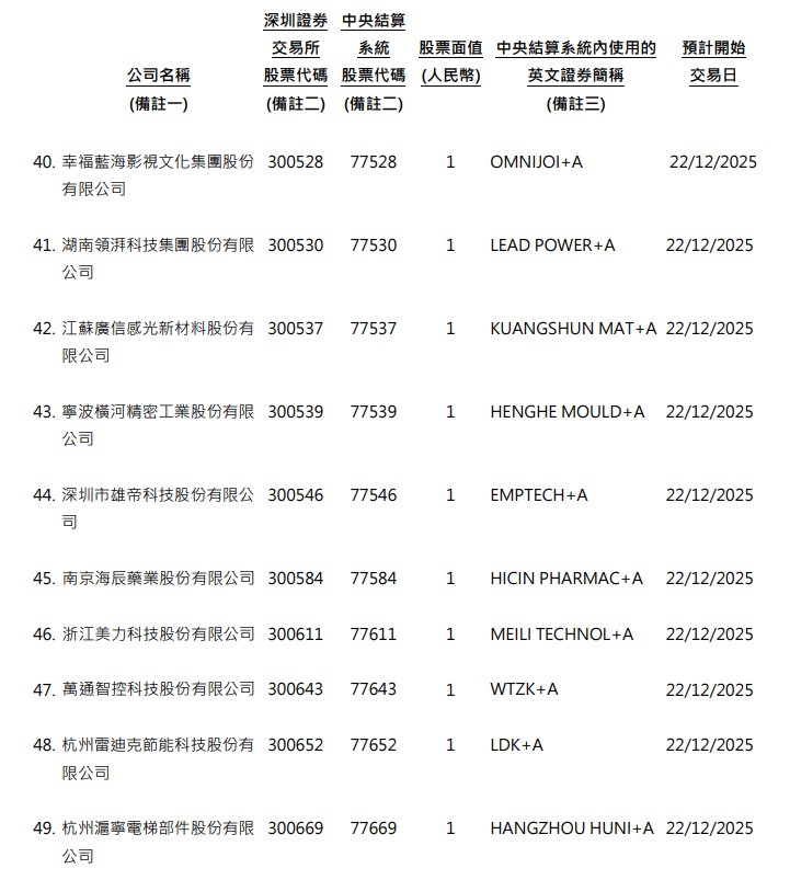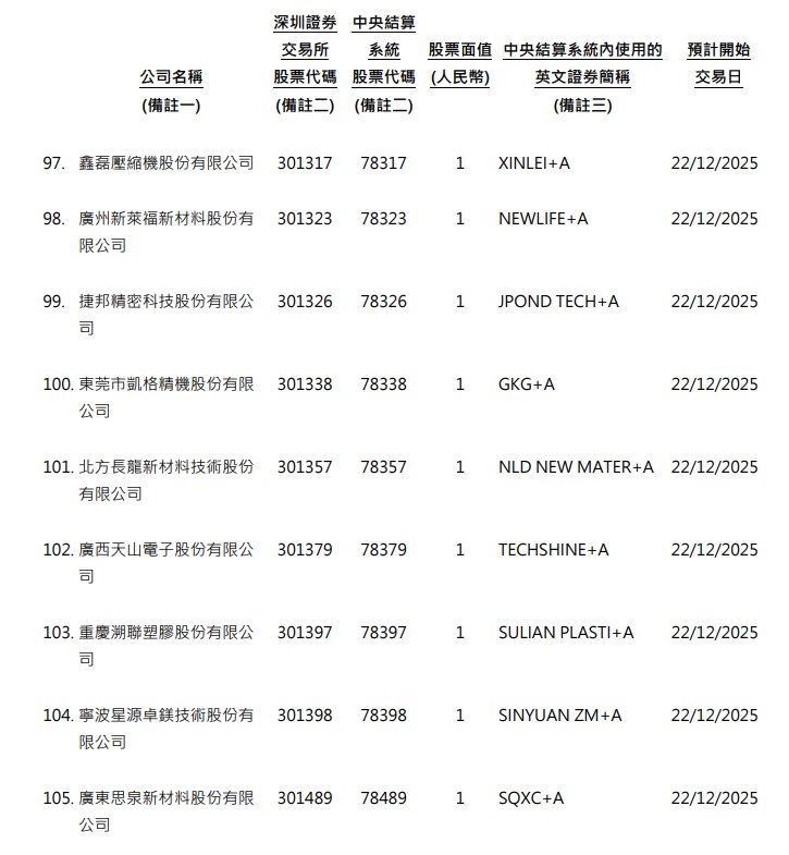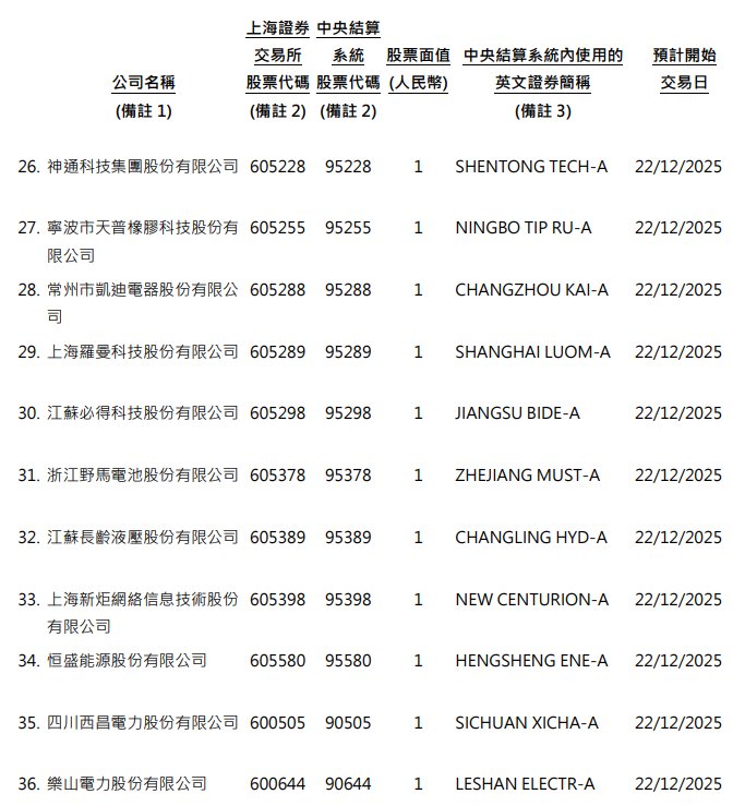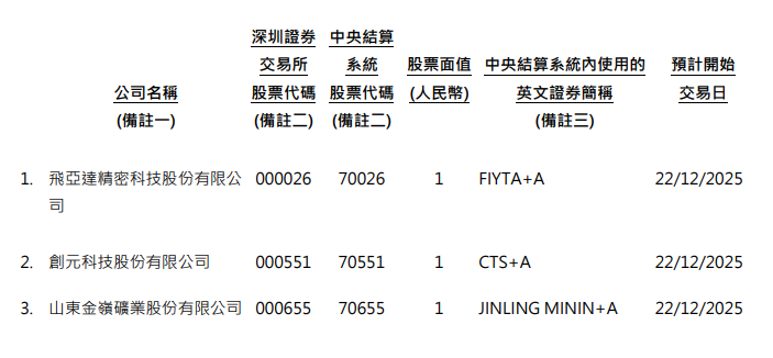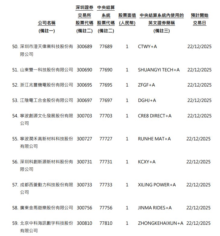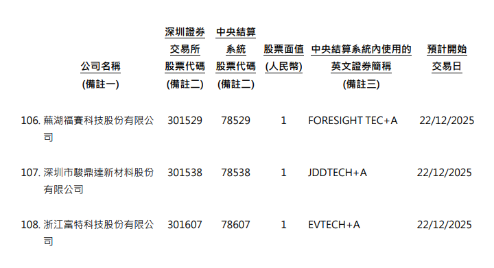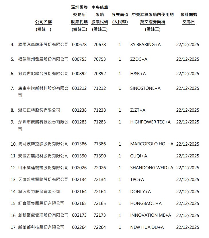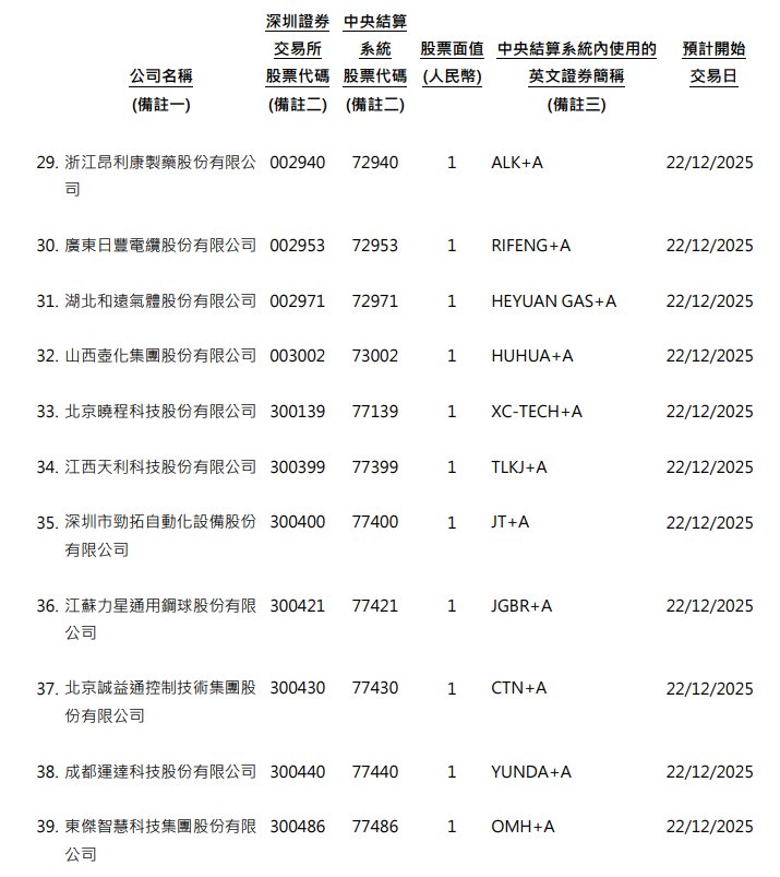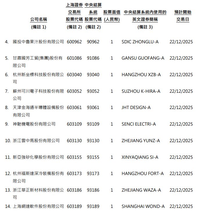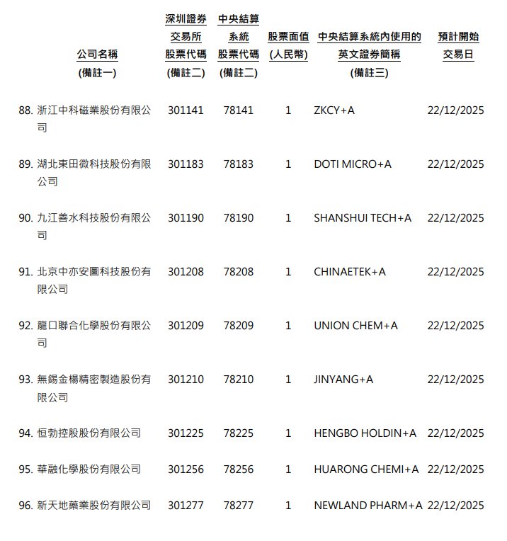 12月17日,港交所发布公告称,交大昂立(600530)(600530.SH)、厦工股份(600815)(600815.SH)、耀皮玻璃(600819)(600819.SH)等共73只股票获纳入沪股通;飞亚达(000026)(000026.SZ)、创元科技(000551)(000551.SZ)等共108只股票获纳入深股通,2025年12月22日生效。